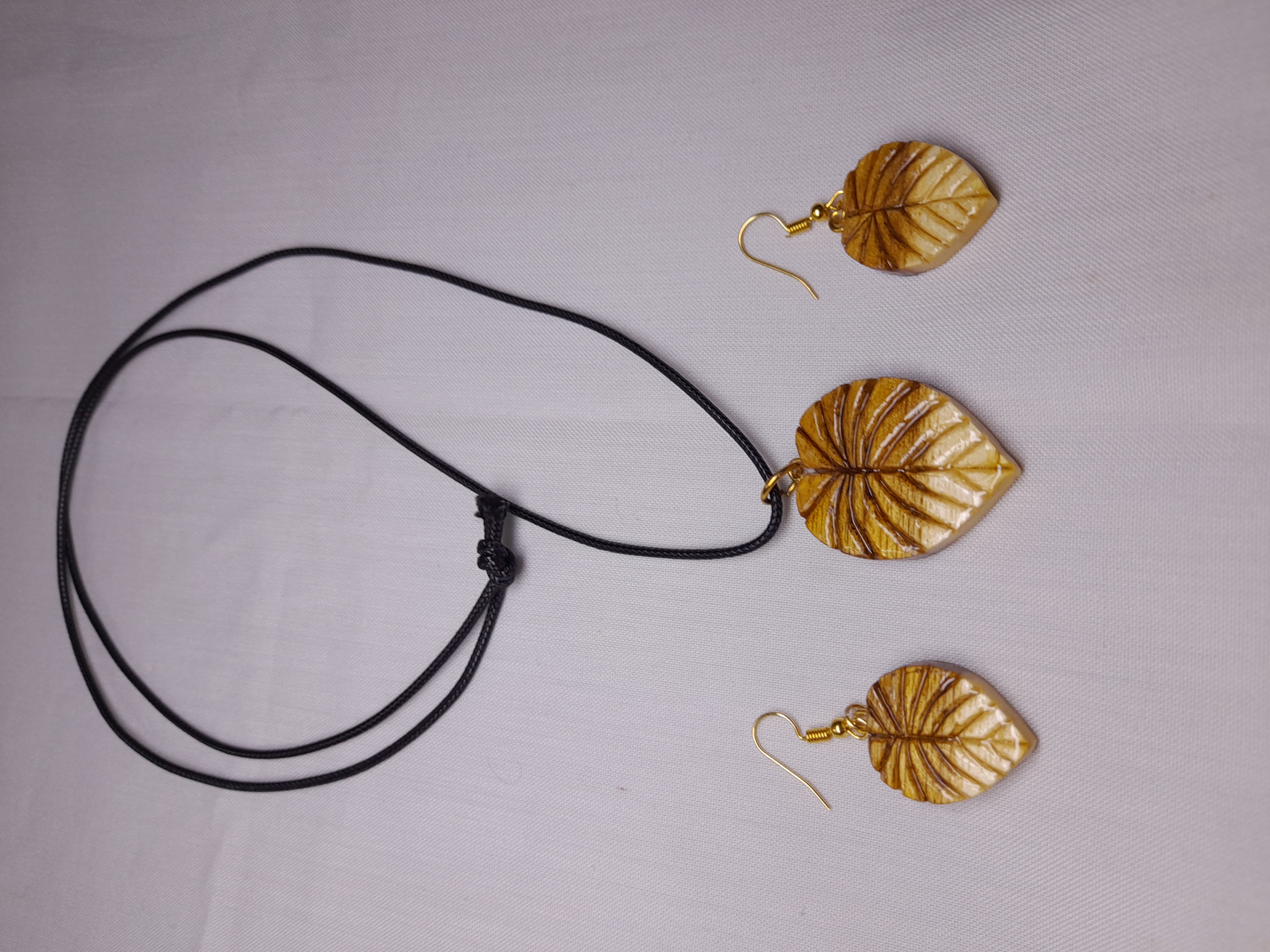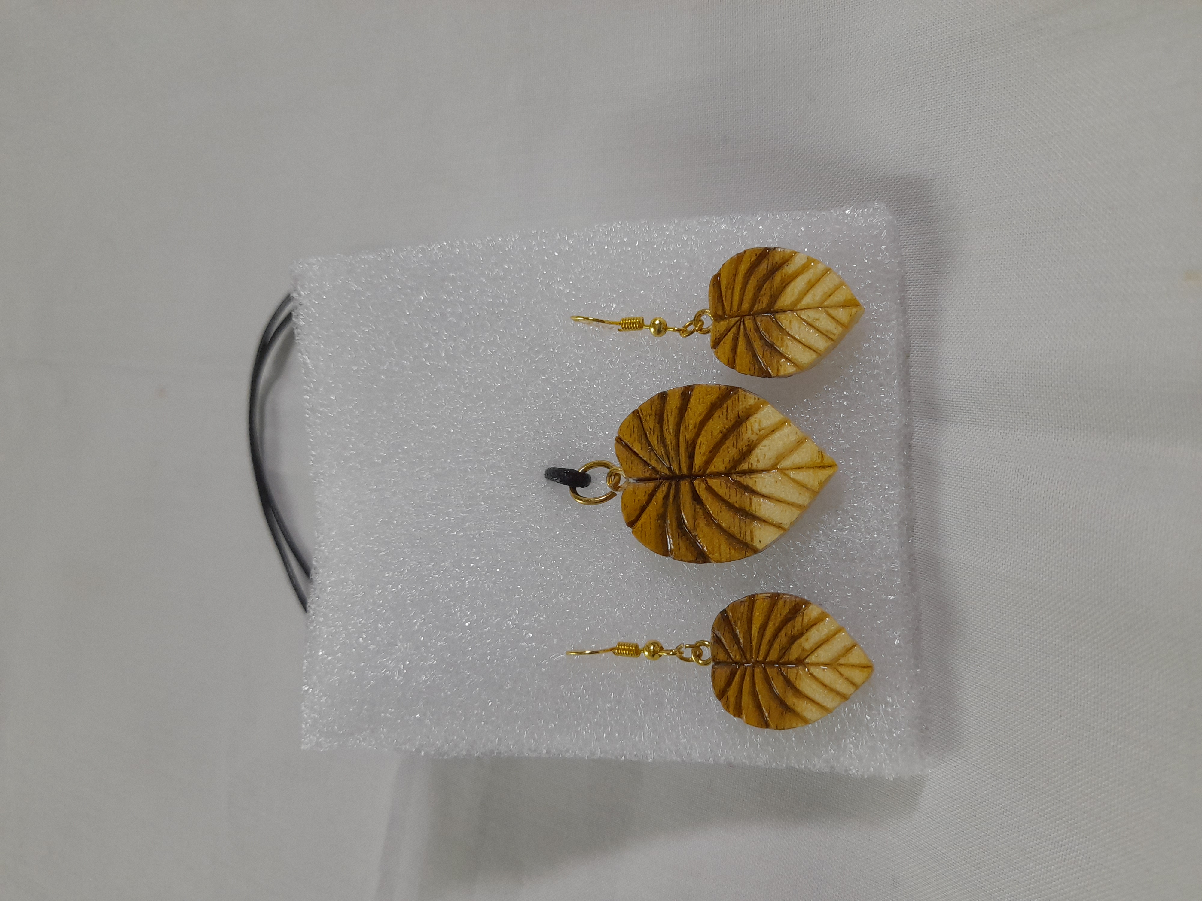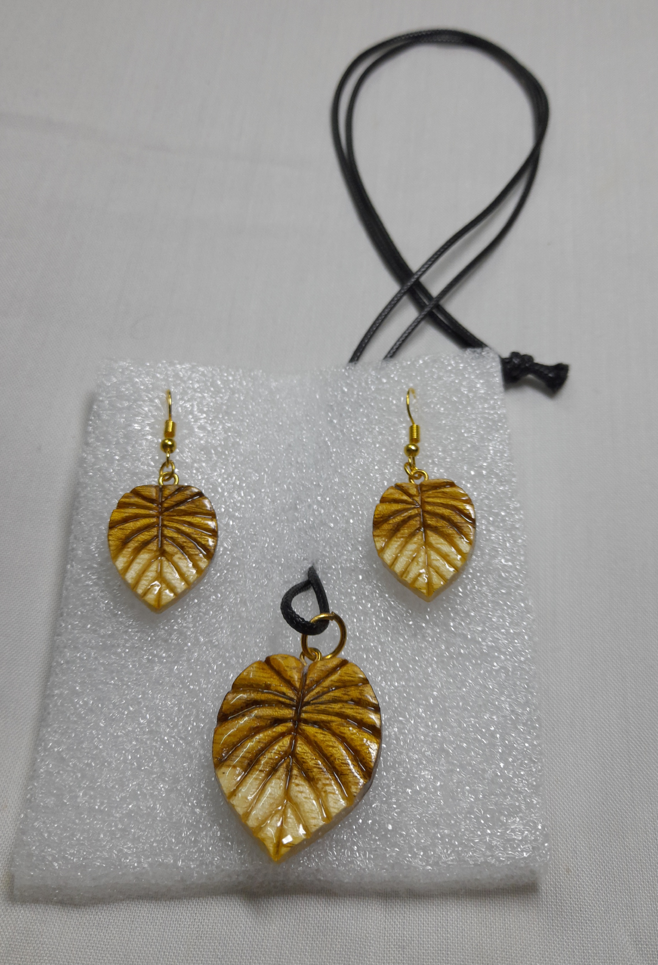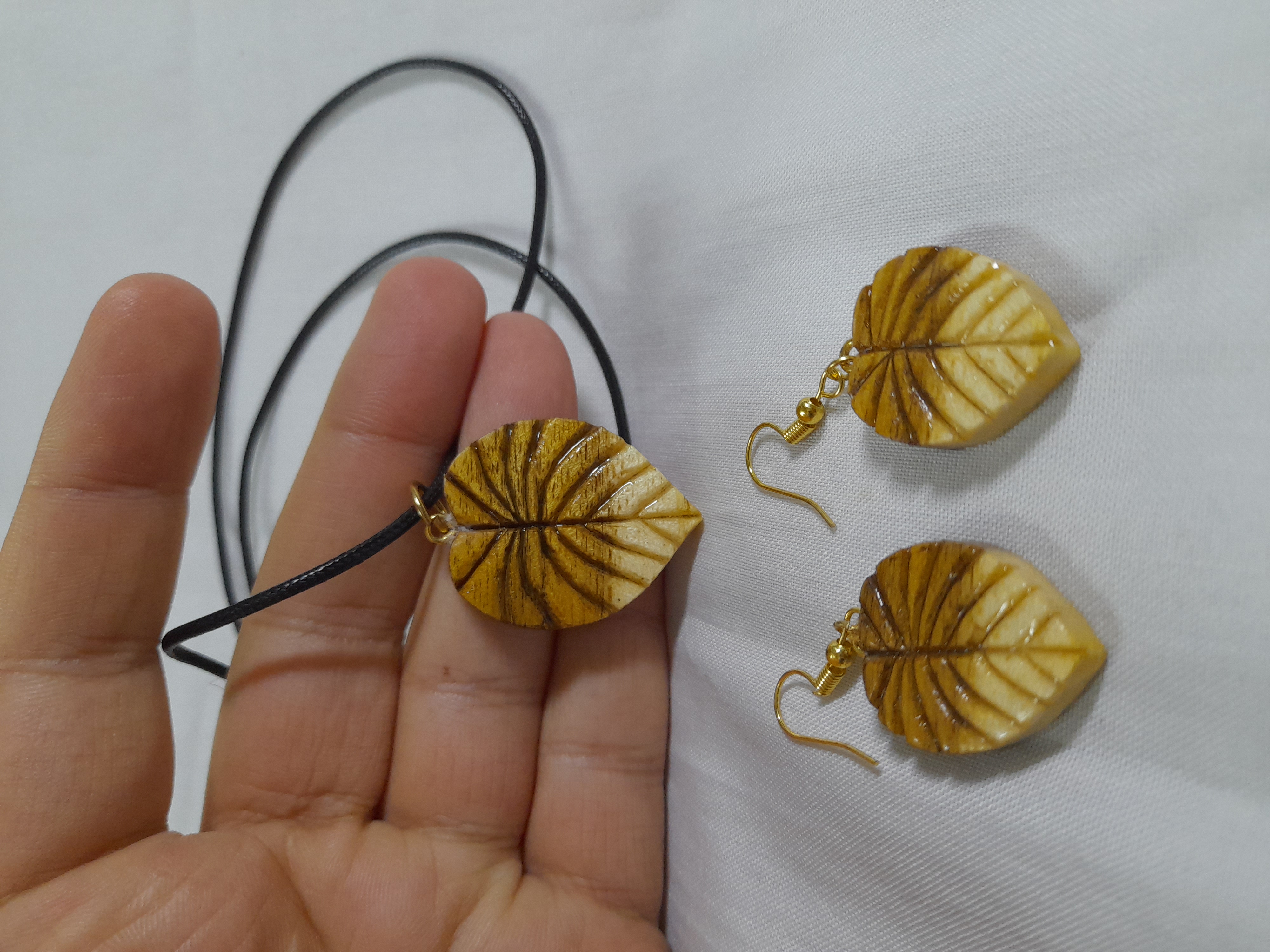 ست گوشواره و گردنبند چوبی معرق و منبت کاری طرح برگ استفاده شده از چوب رنگی اقاقیا دارای روکش رزین وزن ۹ گرم با بند چرمی درجه یک