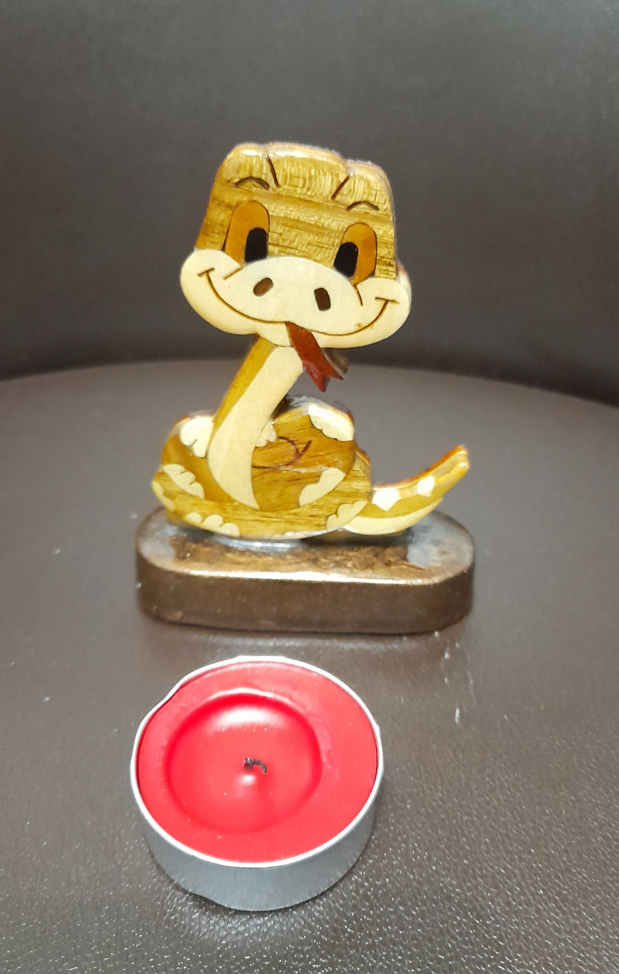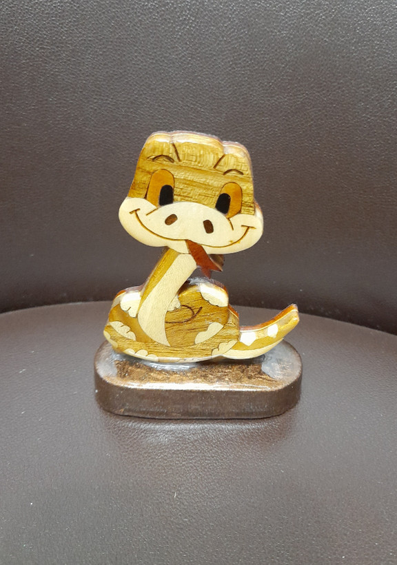استند چوبی دکوری تزئینی مار نماد سال 1404 استفاده شده از چوب های رنگی طبیعی با روکش رزین اقاقیا نارنج عناب و گردو ۳۰ گرم